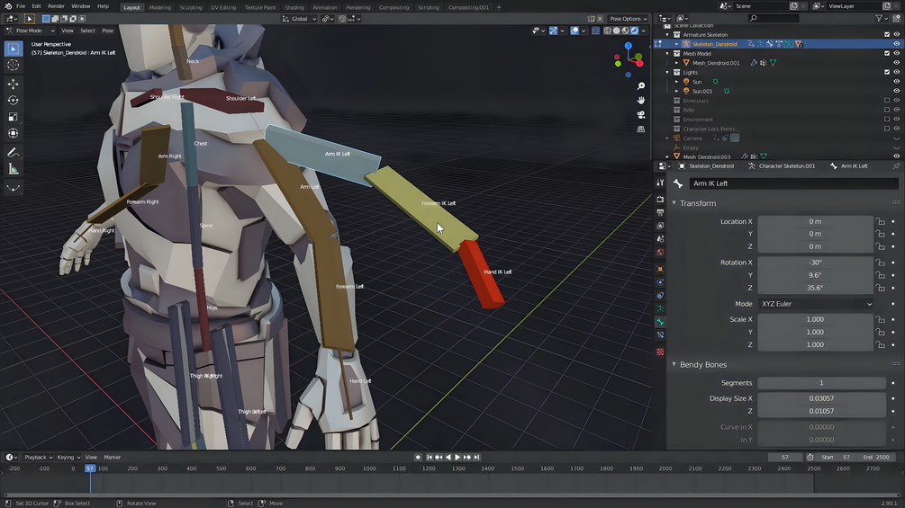 Rigging is the process of attaching 3D meshes to a virtual skeleton. So that a character can move and be animated more naturally. In Blender, this object type is called an Armature. Starting with a single Bone, they can be drawn out as digital joints underneath a character model. Then, after attaching the character model to the bones, it can be posed and animated. This is the best way to get a character moving for a game or animation.